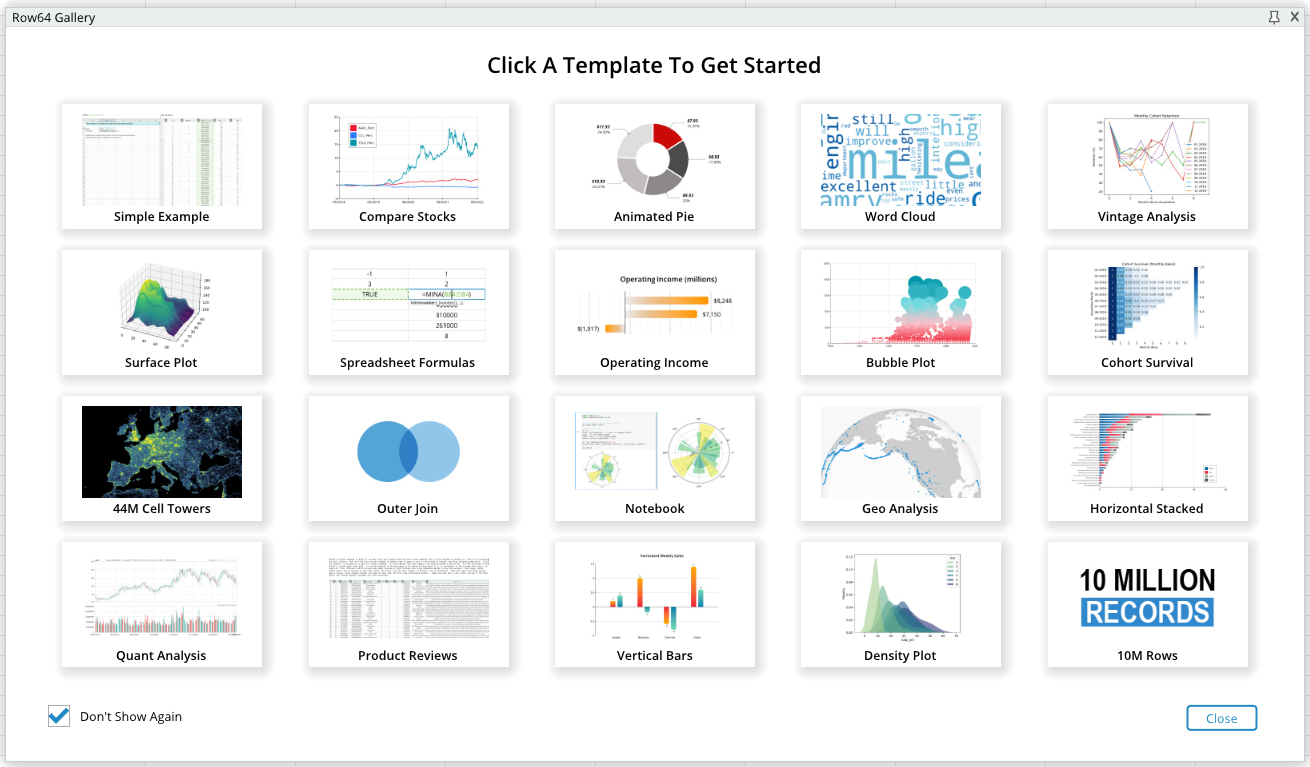 In order to better serve our new users, our V2.0 release comes equipped with a gallery of examples on our range of data visualization, manipulation and discovery tools. Browse example files of geospatial analysis, financial analysis, animated charting, text search to easily grasp the software's functionality.