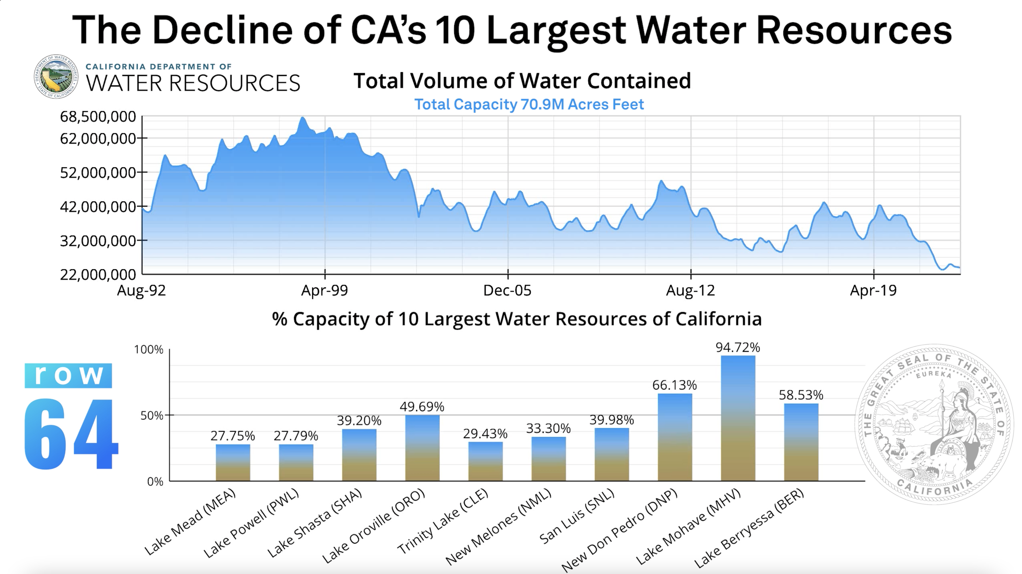 Much has been made of Lake Mead's declining water resources, and so it was of no surprise to us when our animated line and bar chart became one of the top posts on reddit's r/dataisbeautiful. By taking a 30-year retrospective on California's 10 largest reservoirs, we are able to contextualize the current drought to cyclical ones in the state's past — with alarming results.