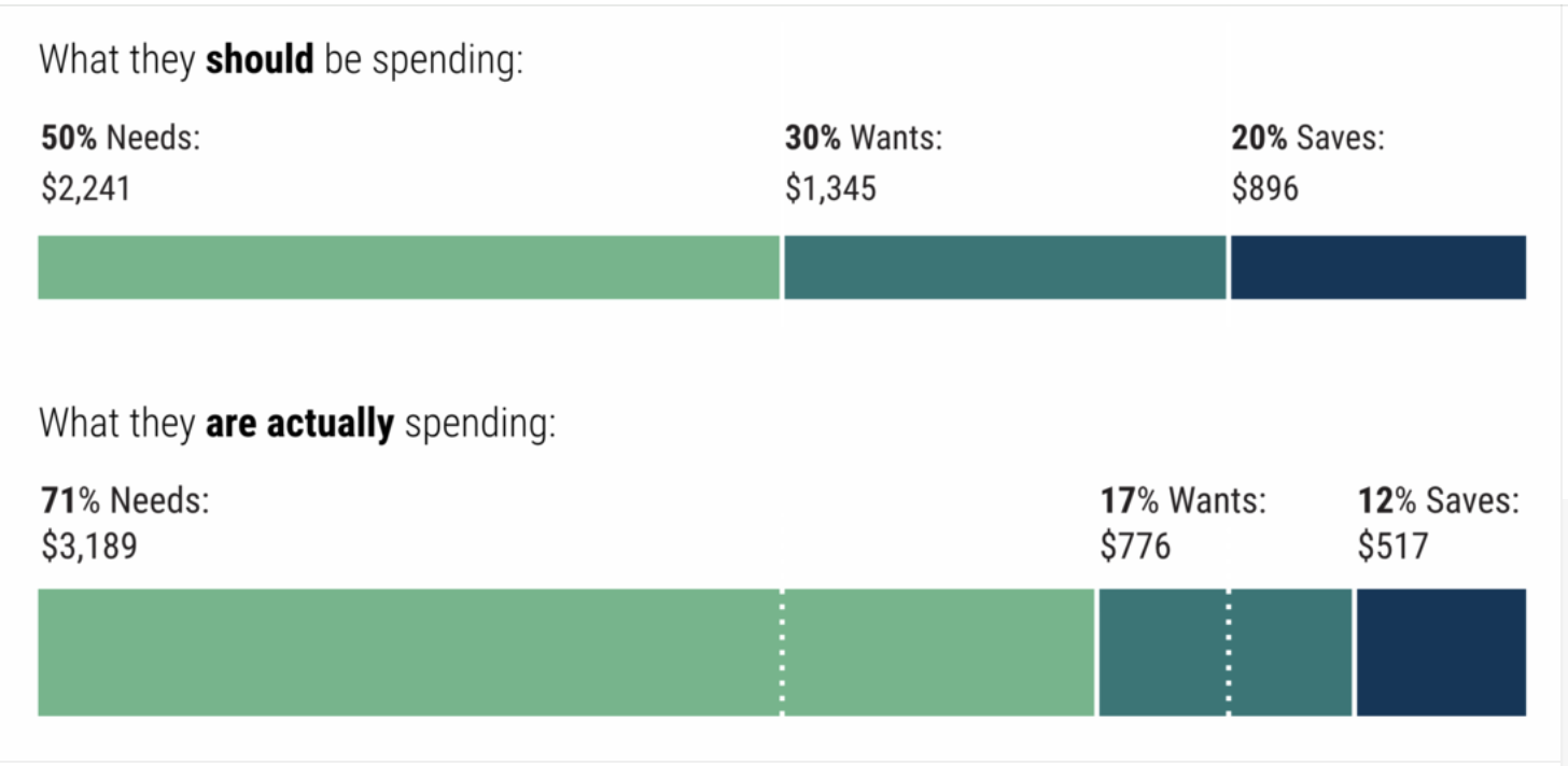 FiveThirtyTwenty was founded on one concept: budgeting shouldn't be complicated. By spending 50% of income on needs, 30% on wants and saving 20%, Americans should be able to achieve some degree of financial stability. The unfortunate reality? The average American is spending way more on needs (71%), and way less in savings (12%). While some data visualizations are impressive because of their complexity, this one is impressive for its simplicity—showing readers exactly how we miss the bar.